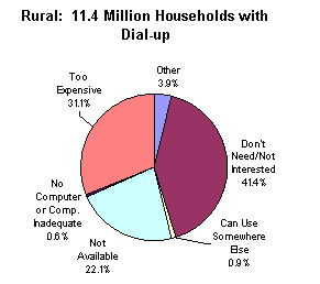 · Rural households with dial-up connections are significantly more likely than their urban counterparts to list "Not Available" as the reason they do not have a higher speed Internet connection (22.1 percent to 4.7 percent, respectively).