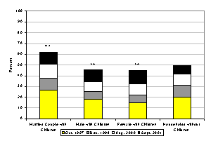 Gender can also be considered in the context of household type.[3] In previous years people who lived in single parent households (where children under the age of 18 are present) headed by women were less likely to be Internet users. The Internet use rate among people living in female-headed single parent households grew dramatically between August 2000 and September 2001, and the differential between Internet use rates between people living in male and female single parent households has largely disappeared.