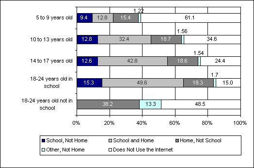The high rate of Internet use outside the home among young people 10 years old and up is considerably different from the overall national figures for all ages, and is largely accounted for by use at schools, as discussed in the following section.