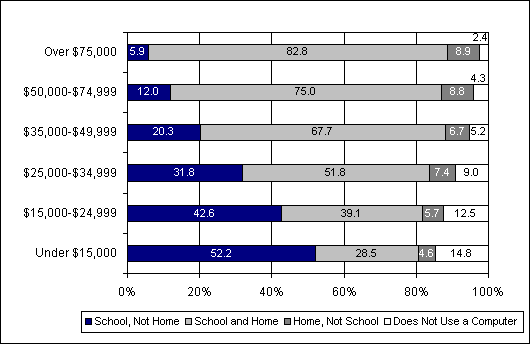 Schools also provide an important resource for Internet use for all children, regardless of their background. The levels of school-only Internet use, however, are not as high as the levels of school-only computer use. As a result, the availability of the Internet at schools does not compensate for disparities in home use to the same degree as computer use in schools.